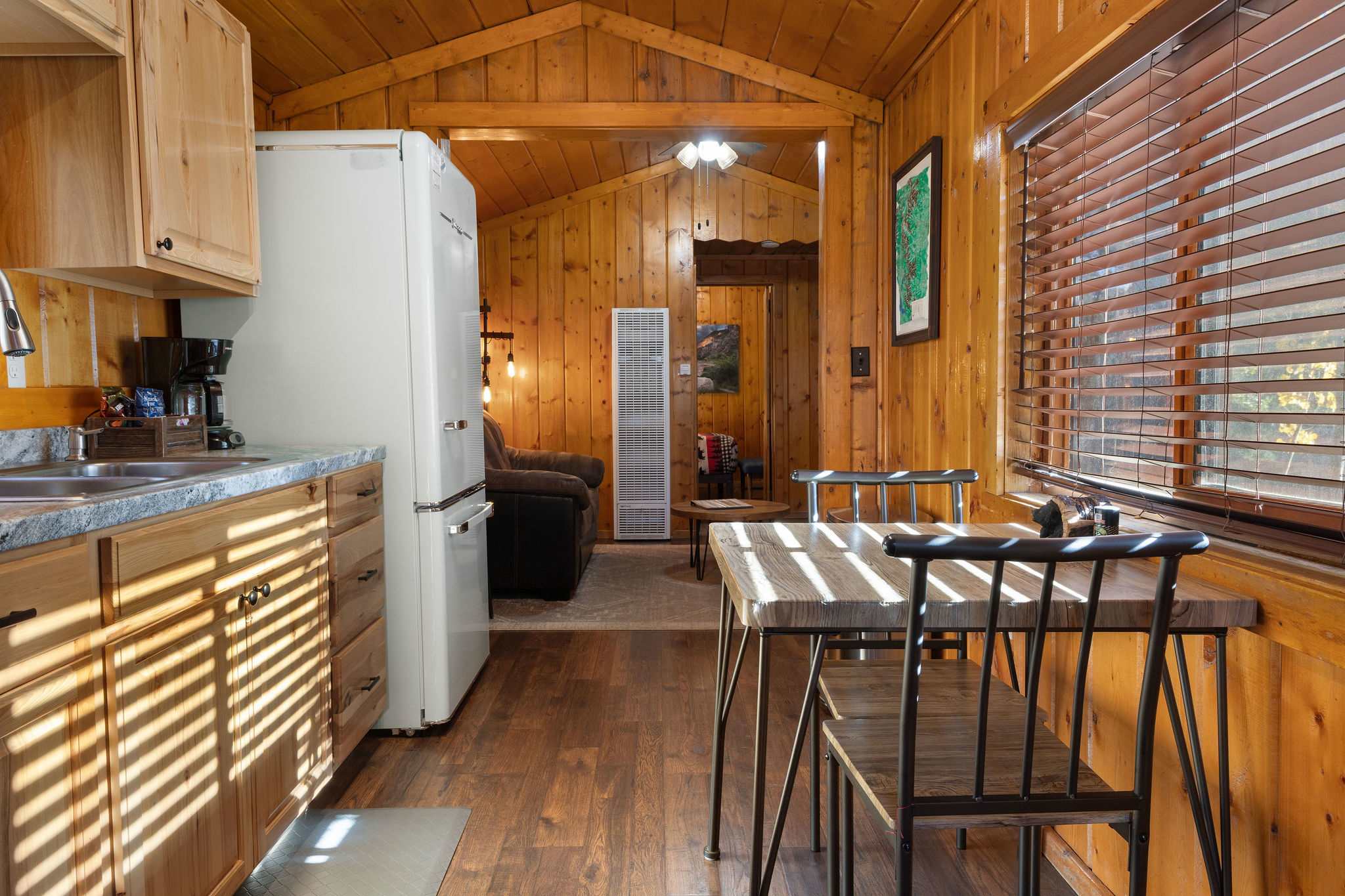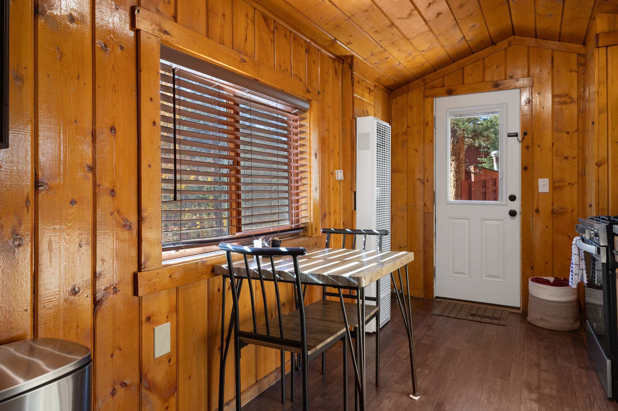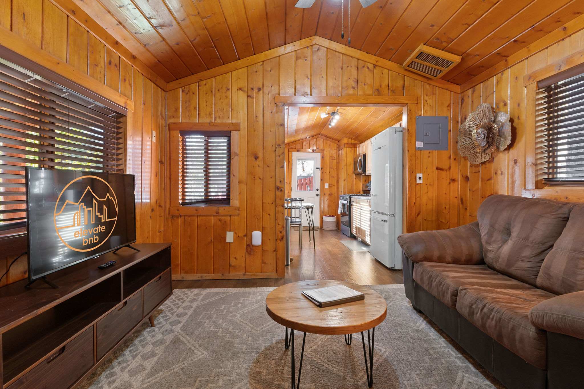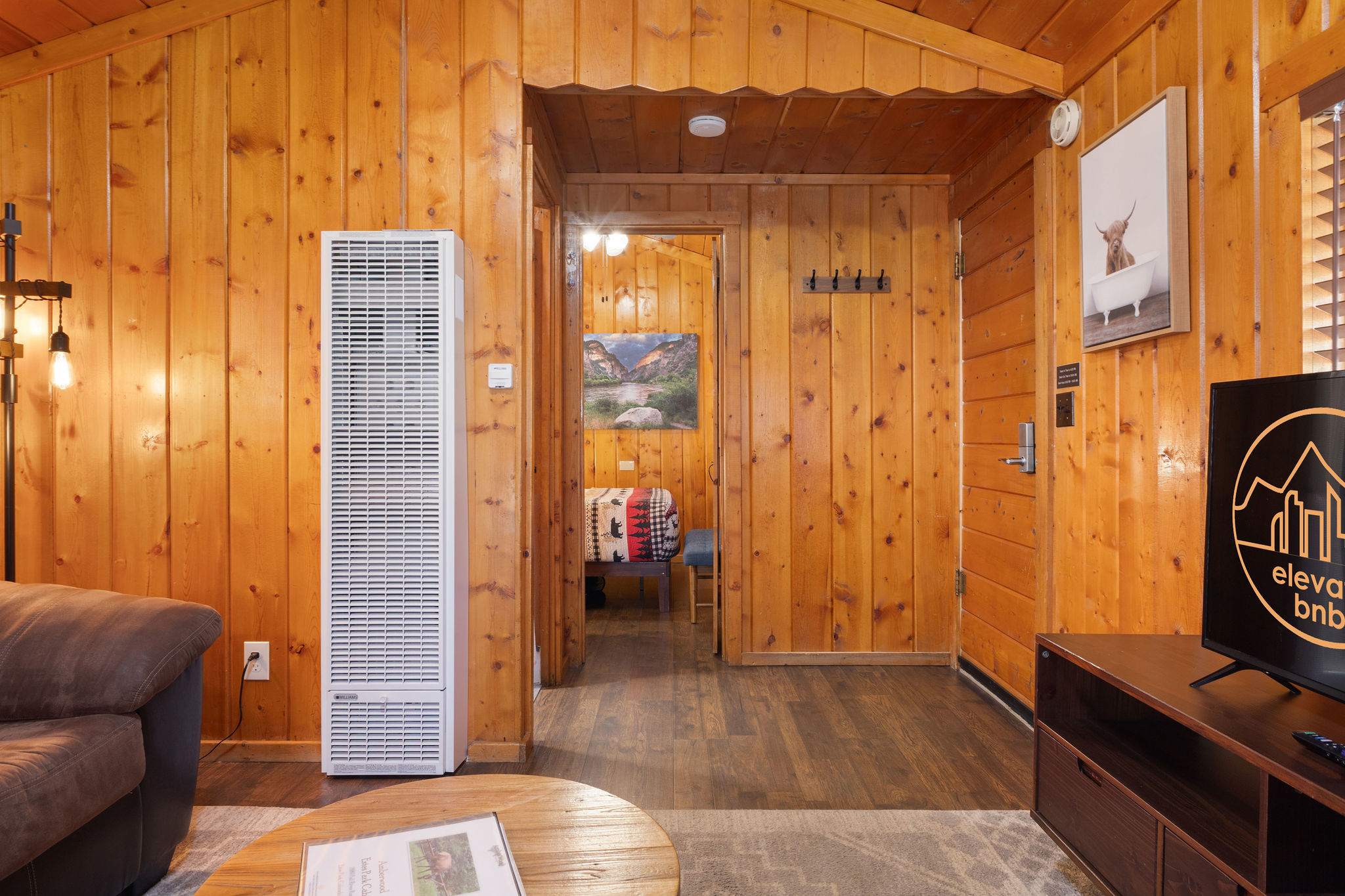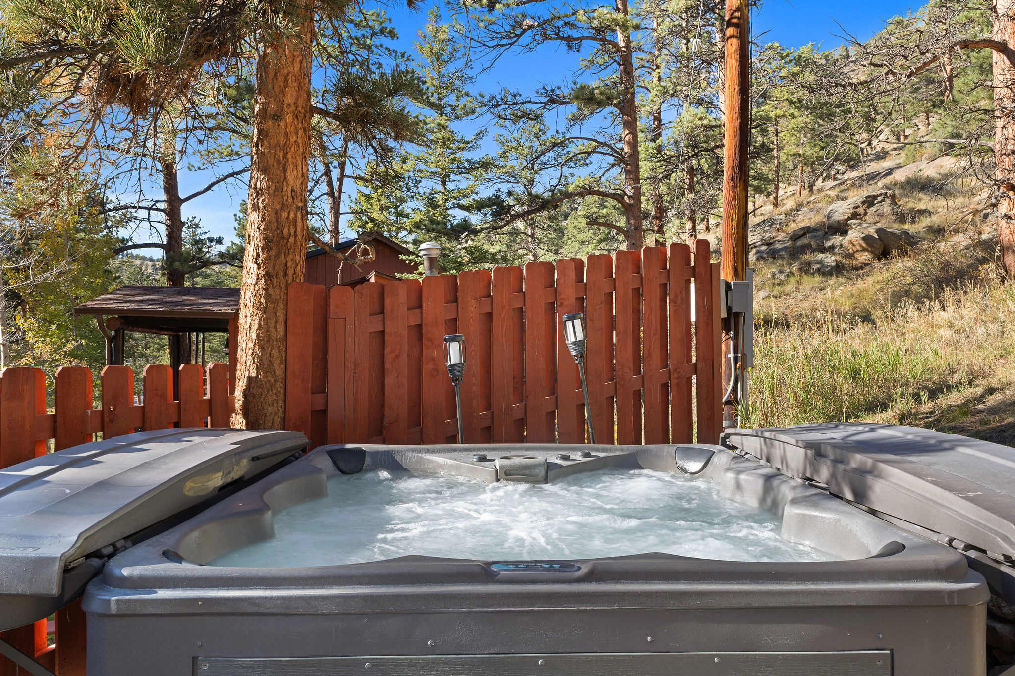 - 1 bedroom with comfortable Queen bed - 1 full bathroom with standing shower + complimentary toiletries - Back patio with private 4-person hot tub - Full kitchen w/ updated appliances + complimentary coffee - Large living room with 43” Roku TV - Private front porch with outdoor dining space - High-speed WiFi throughout property - Free parking in front of cabin - Perfect location near Rocky Mountain National Park Bedroom & Bathroom This rustic cabin features a brand-new Queen bed. The bedroom features natural wood finishes, a high-powered ceiling fan, small closet to hang your clothes and a bench to set your luggage on. The bathroom features a newly-renovated standing shower and a small window to let in natural light. The bathroom is fully stocked with fresh towels and complimentary toiletries for your convenience. Kitchen & Living Space The cabin enters into the spacious living room which features a comfortable loveseat sofa, large HD TV, a ceiling fan and lamps for lower lighting. The living room opens to the full kitchen on the other side of the cabin. The cabin features 2 separate heating units & thermostats- one in the living room and one in the kitchen. These units keep the cabin nice and toasty when it is cold outside. The cabin also has a swamp cooler to cool the cabin down if it gets too hot in the summer. We also have portable fans and ceiling fans for your use. Experience the best of both worlds with a rustic cabin ambiance and high-end updated appliances. The spacious kitchen has a full-sized gas oven, full-sized “retro” style refrigerator and all of the extra items you need to create a meal. Enjoy a cup of coffee at the 2-seat dining table in the kitchen, or sit on the front porch and take in the fresh mountain air. We provide all the necessities like dishes, cookware, baking sheets, utensils and of course, coffee! The kitchen has a back door that opens to the back patio and the private four-person hot tub. Outside Space This gorgeous cabin has a large, covered front porch with a table and chairs. Enjoy a cup of coffee in the fresh Rocky Mountain air while you enjoy the gorgeous views. On the side of the cabin off the kitchen is the private hot tub. This large, four-person hot tub is the perfect place to relax after a hike or to look at the stars after dark. There is also a seating area and solar lights for ambiance while soaking in the hot tub. *Do not leave pets unattended in cabin without kennel or crate. Our water system relies on a well, and we request your assistance in conserving water regularly while in Colorado. You might receive reminders from us to be mindful of your water usage during your stay. Brought to you by Elevate BNB Management.