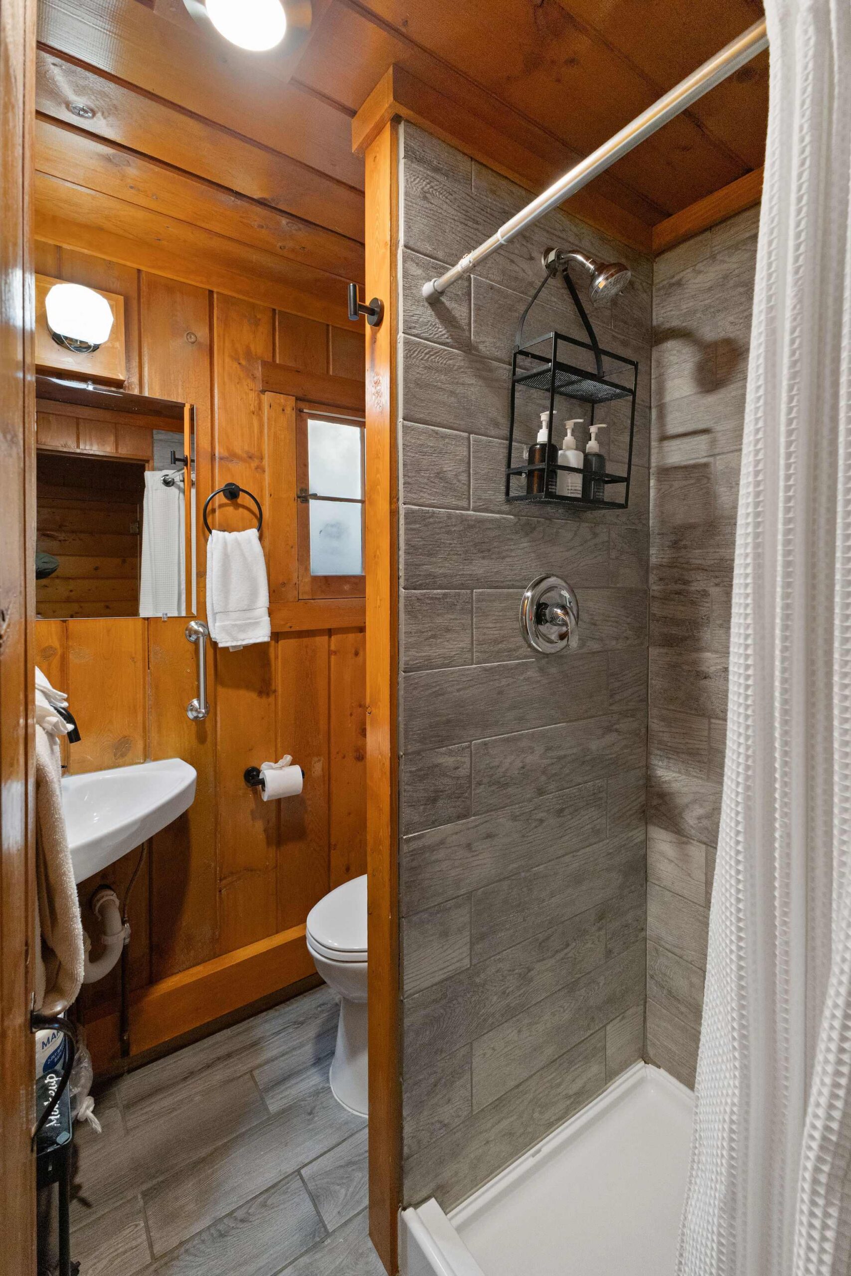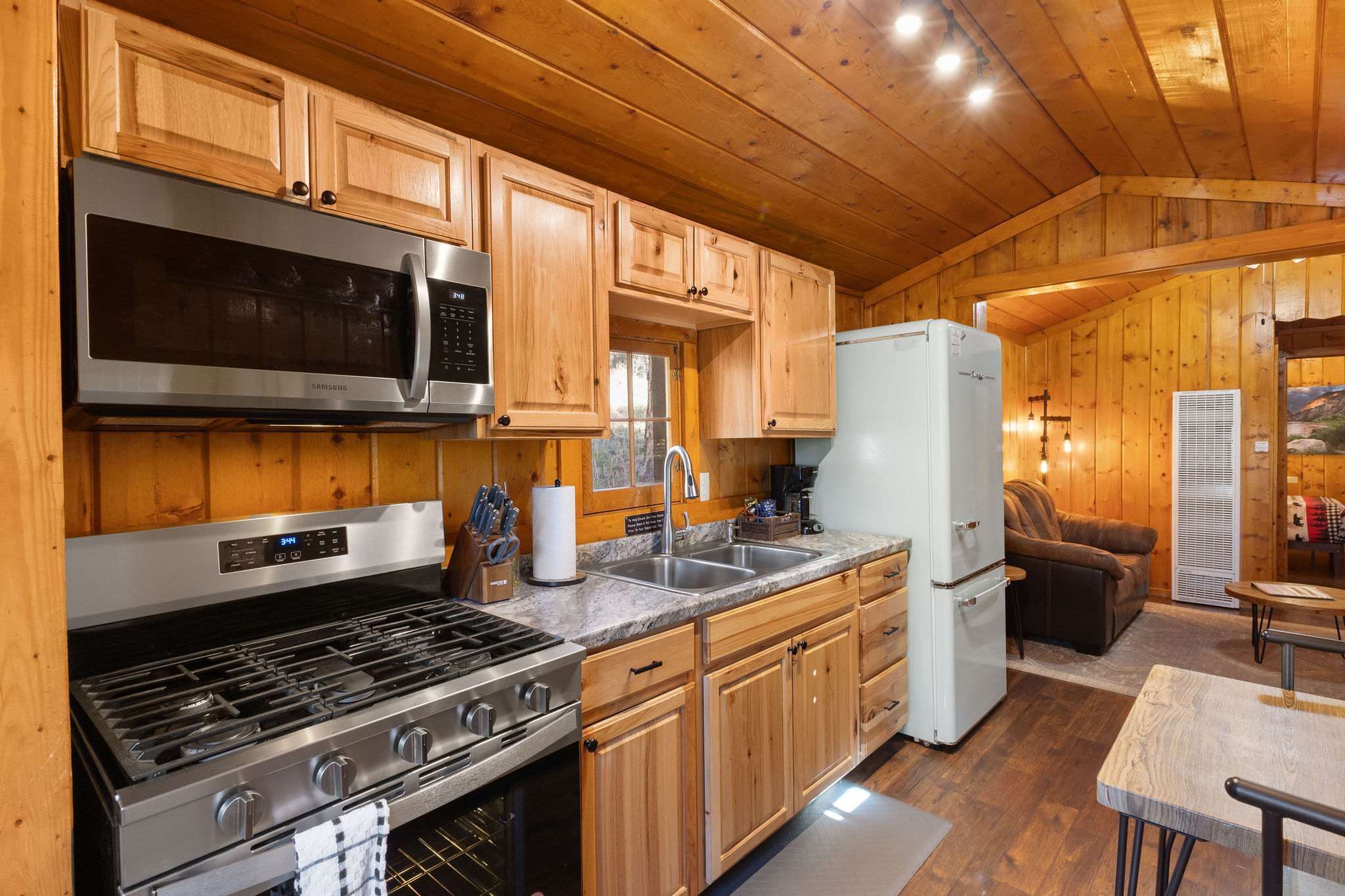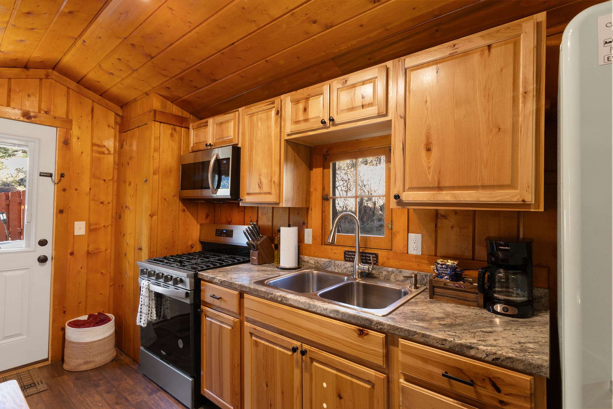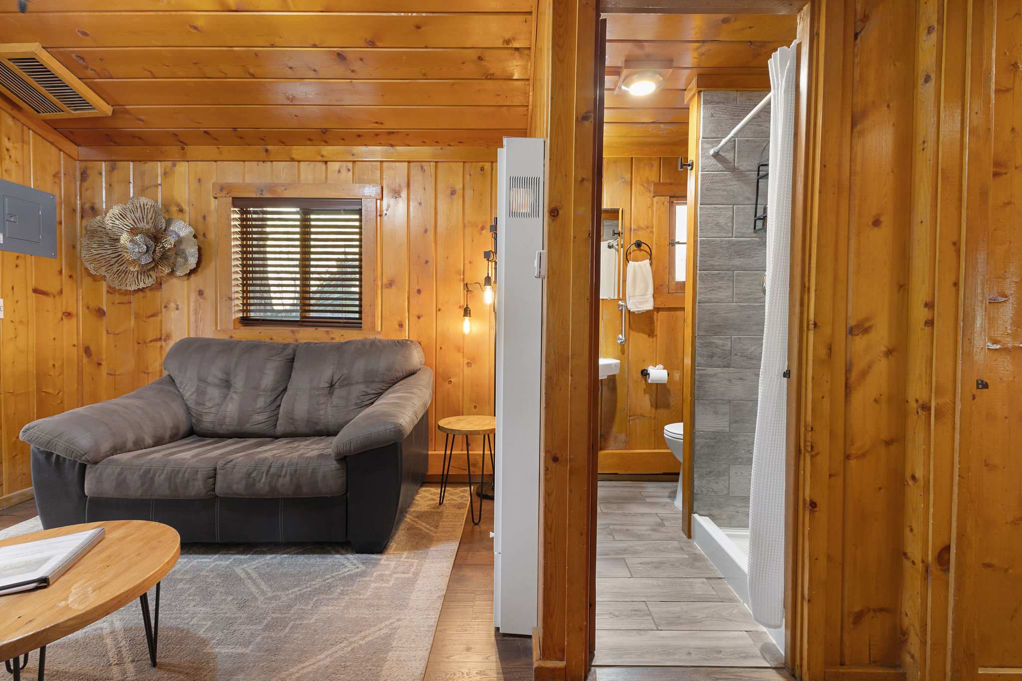 Guests can access the entire cabin as well as our playground and communal spaces on the resort property. There is a new community firepit and cornhole game located in front of the Grand Lodge by the playground. The Lobby, located at the front of the property by Fall River Road, offers a paid guest laundry room, pamphlets for local attractions, and a coffee bar. You can access the door with your cabin code.