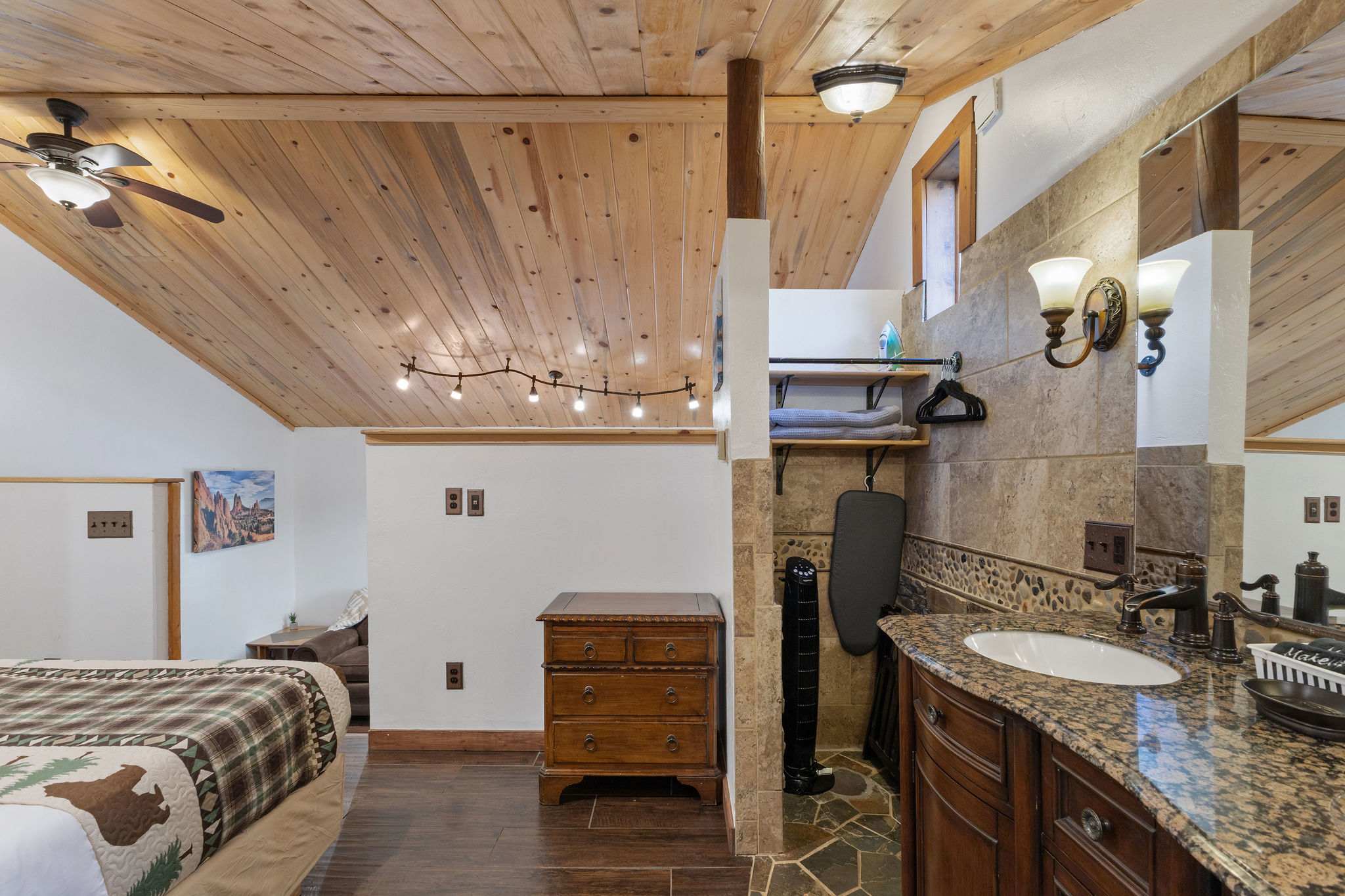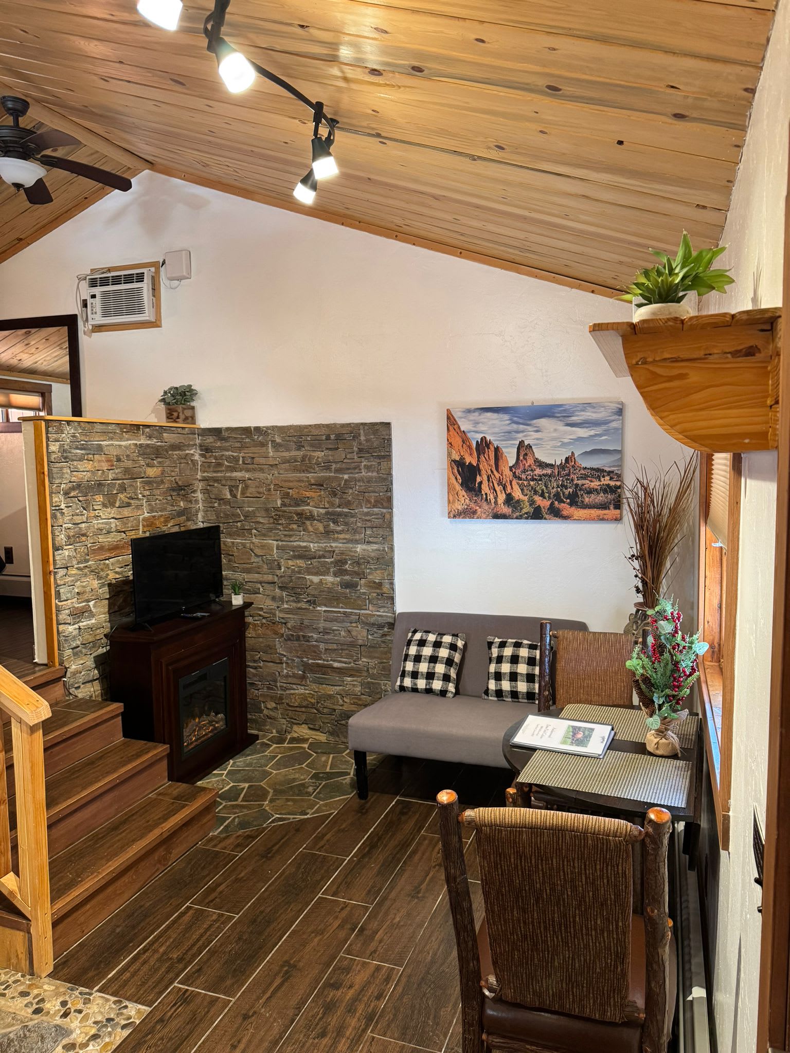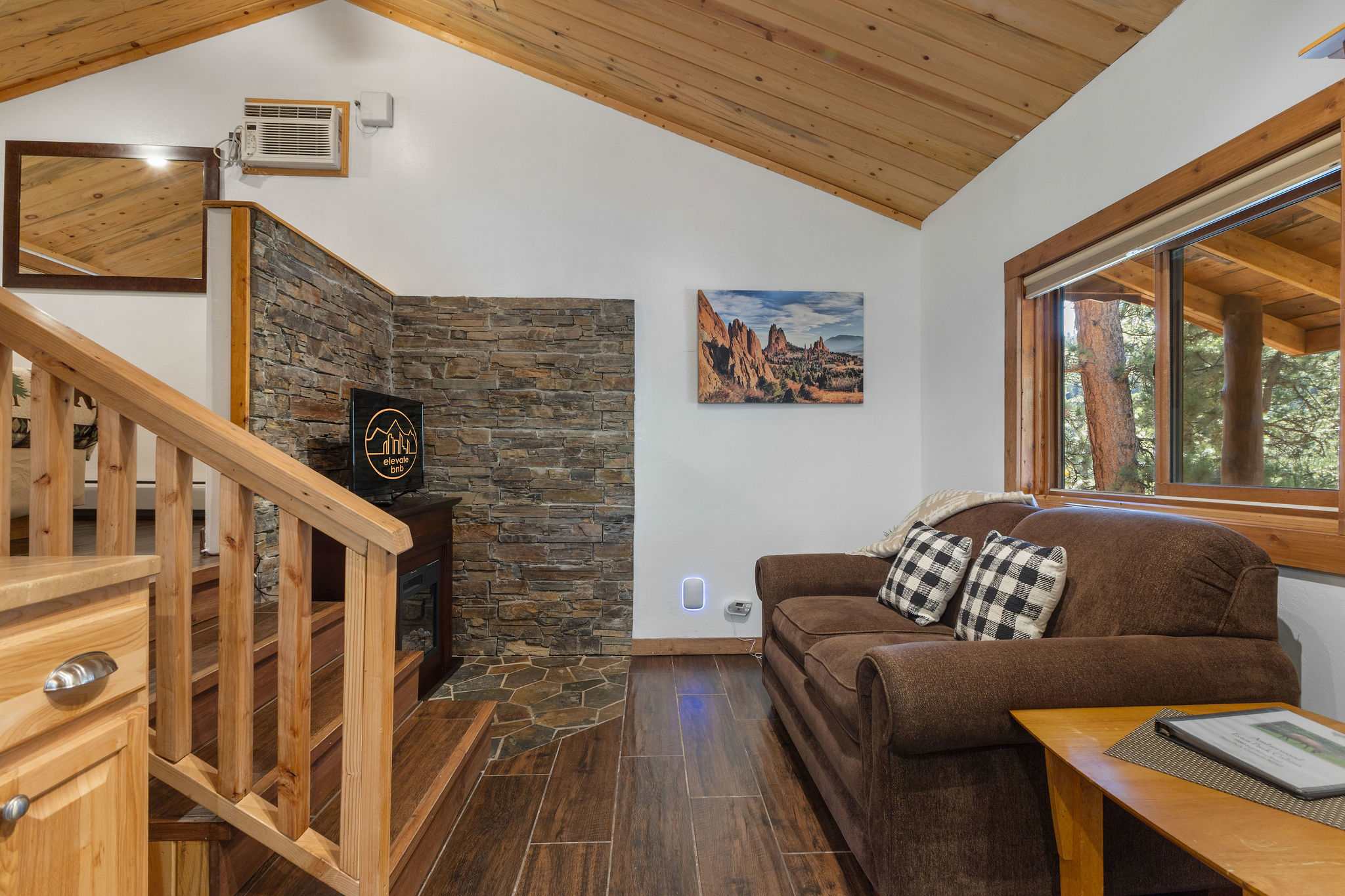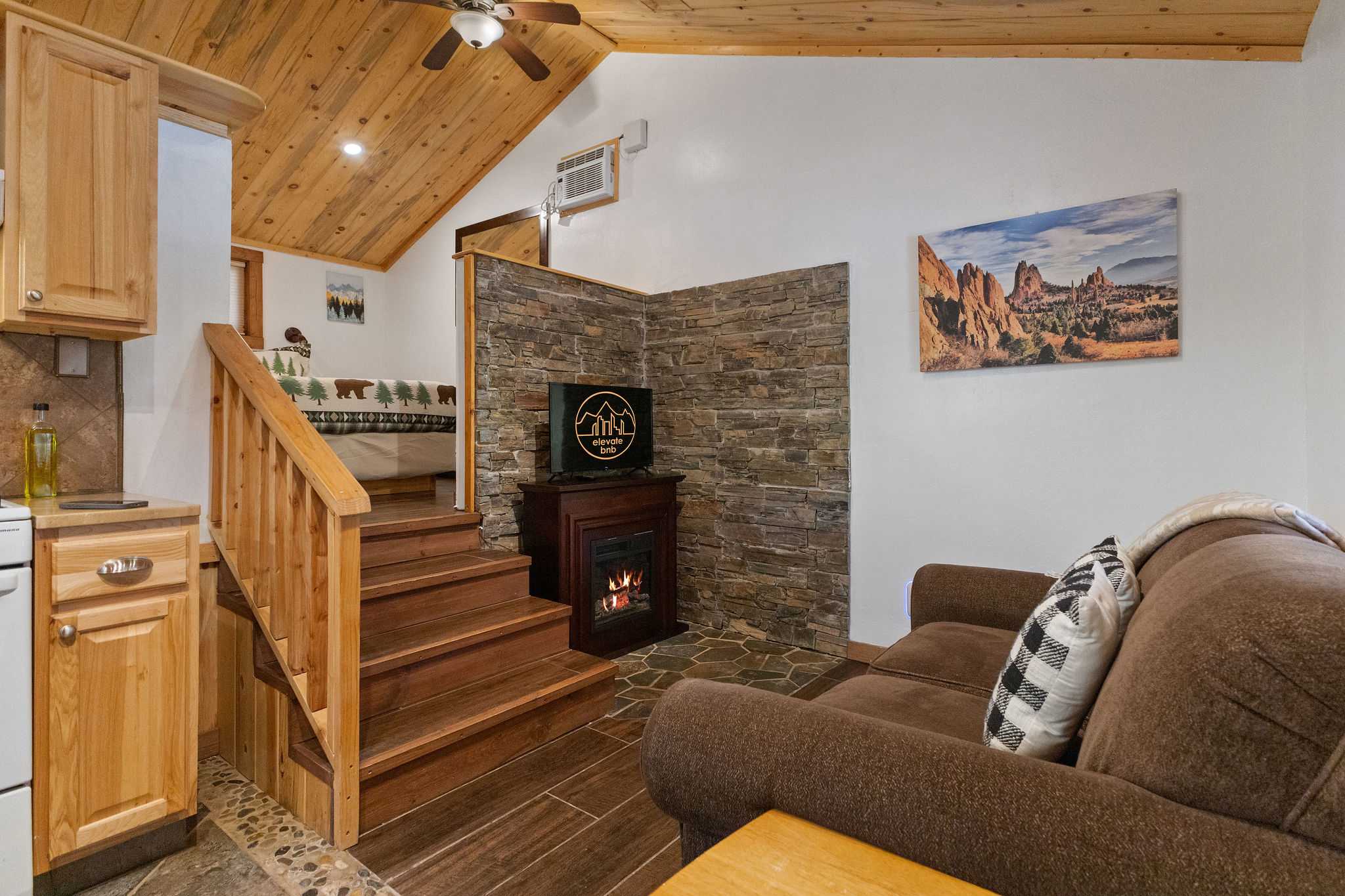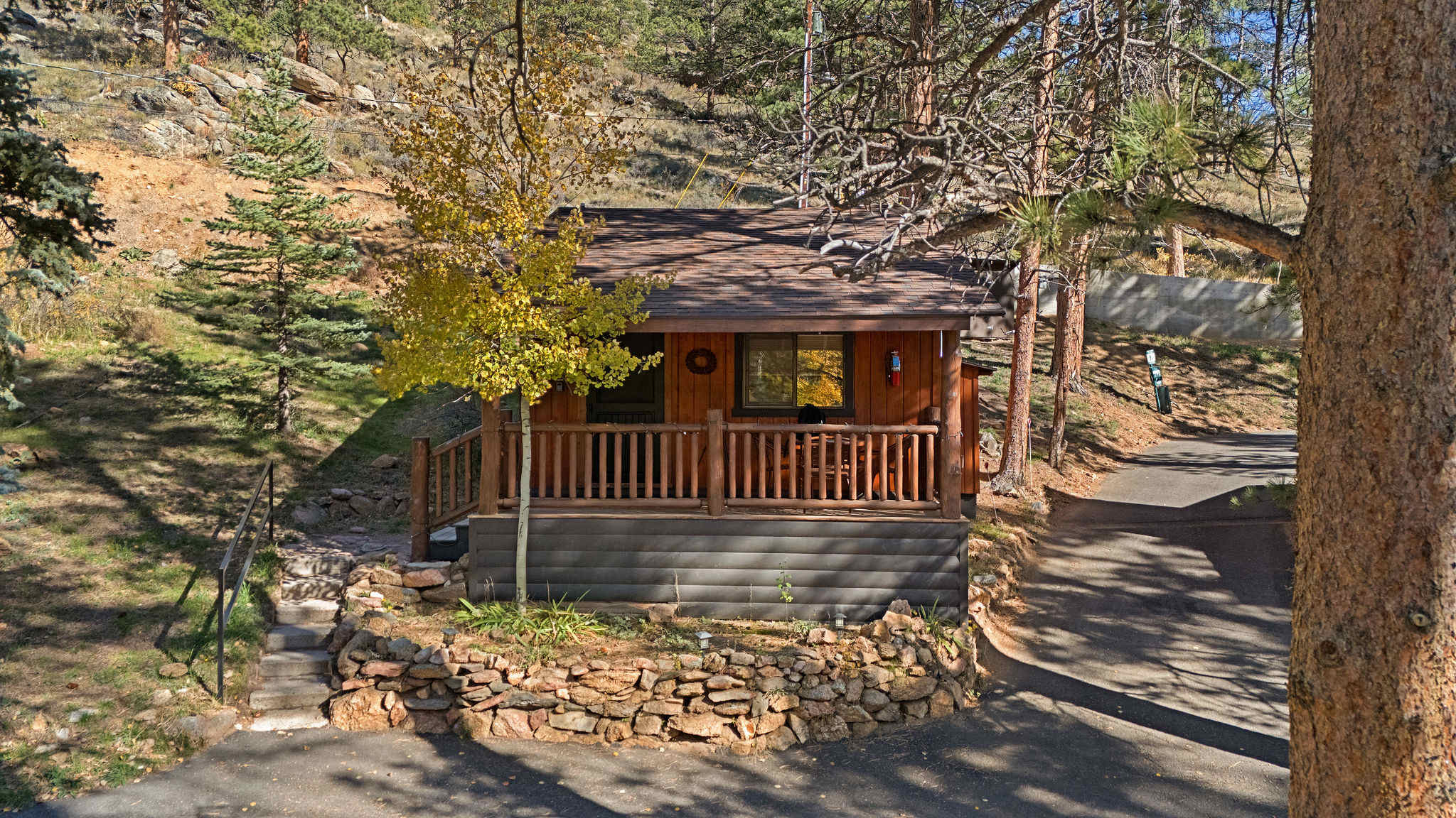 Key Features: - 1 Loft area with a King sized bed - 1 full bathroom with shower + complimentary toiletries - Kitchenette w/ dining table + complimentary coffee - Living room with loveseat, electric fireplace + HD Roku TV - Private front porch with outdoor dining space - High-speed WiFi throughout property - Free parking in front of cabin - Perfect location near Rocky Mountain National Park Bedroom & Bathroom This cabin features a comfortable King sized bed up a few steps in the loft area. Each side of the bed has it's own built in reading lamp and a side table. The large double sink is in the bedroom area, right next to the sliding door for the bathroom. The bathroom features a newly-renovated standing shower and windows to let in natural light. The bathroom is fully stocked with fresh towels and complimentary toiletries for your convenience. Kitchen & Living Space The cabin opens into the kitchenette area, complete with mini gas stove, microwave, toaster, refrigerator and coffee maker. Always fully stocked with coffee, cream and sugar. The kitchen has the items you need to create and enjoy a meal such as cookware, dishes and silverware. There is a 2 person dining table next to the large front window where you can enjoy your meal. Further past the dining table is the living space which features a small loveseat, electric fireplace and an HD Roku TV. Curl up on the loveseat and stream a movie or TV show! Outside Space This gorgeous cabin has a large, covered front porch with a table and chairs. Enjoy a cup of coffee in the fresh Rocky Mountain air while you enjoy the lovely views. *Do not leave pets unattended in cabin without kennel or crate! Our water system relies on a well, and we request your assistance in conserving water regularly while in Colorado. You might receive reminders from us to be mindful of your water usage during your stay. Brought to you by Elevate BNB Management.