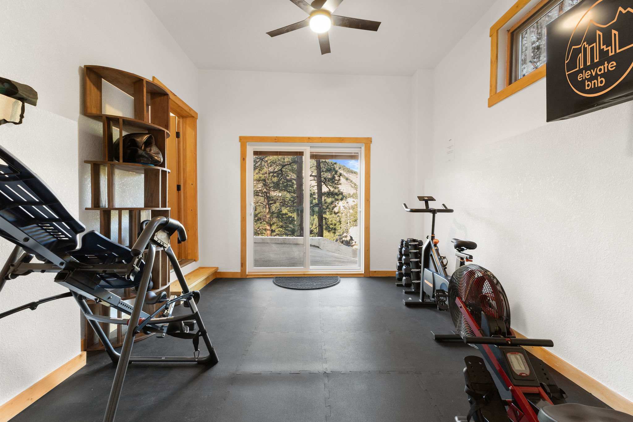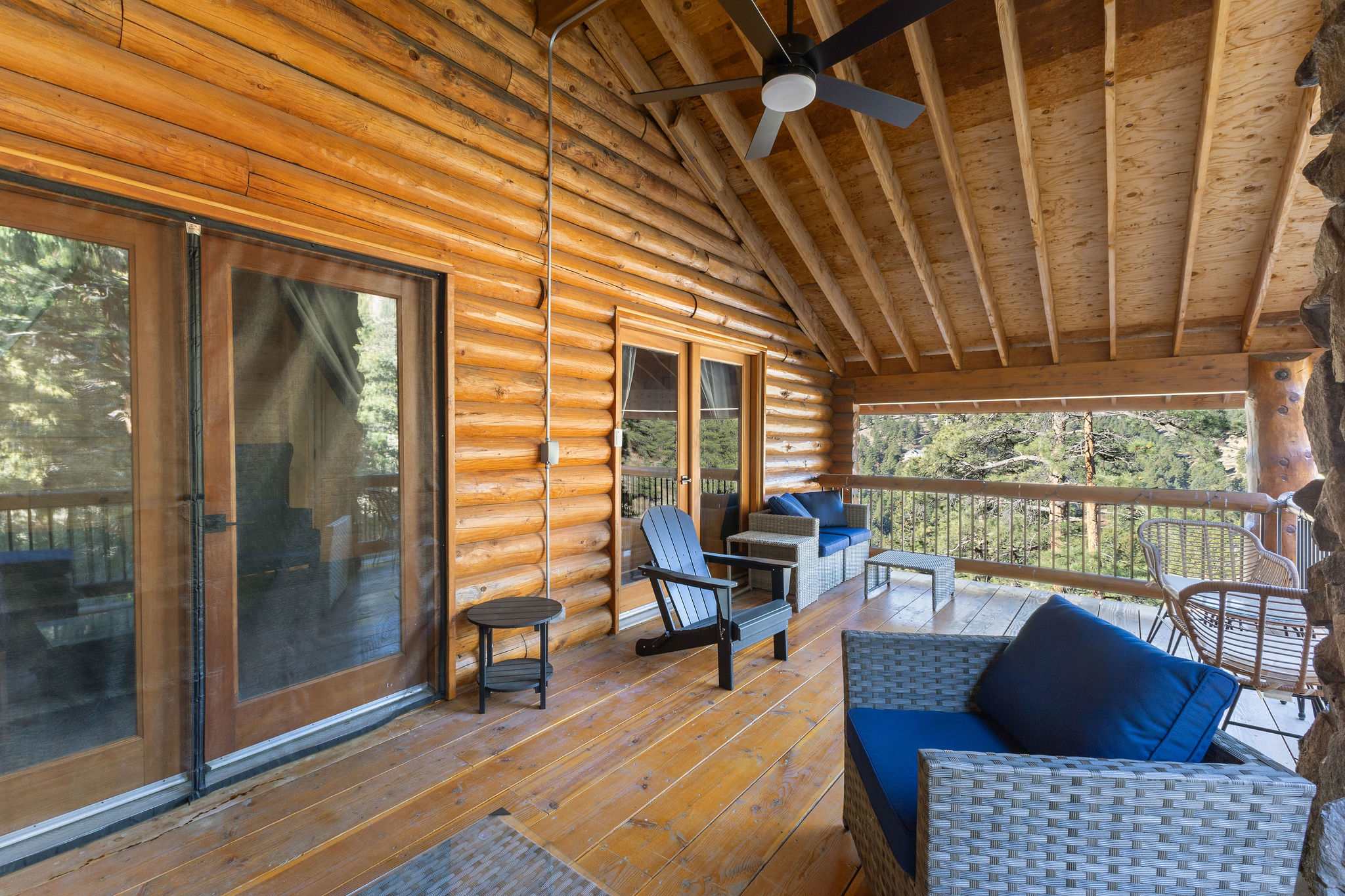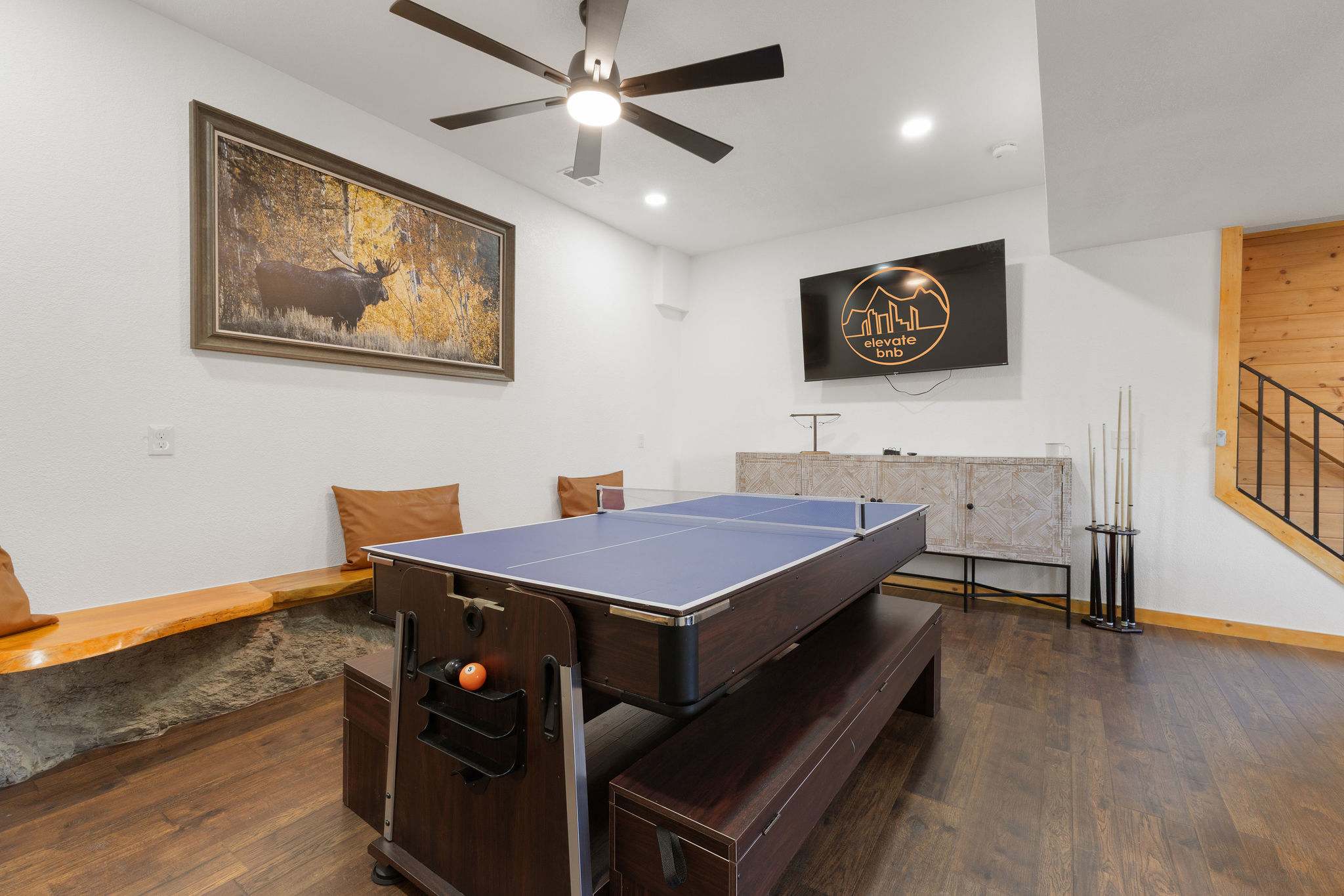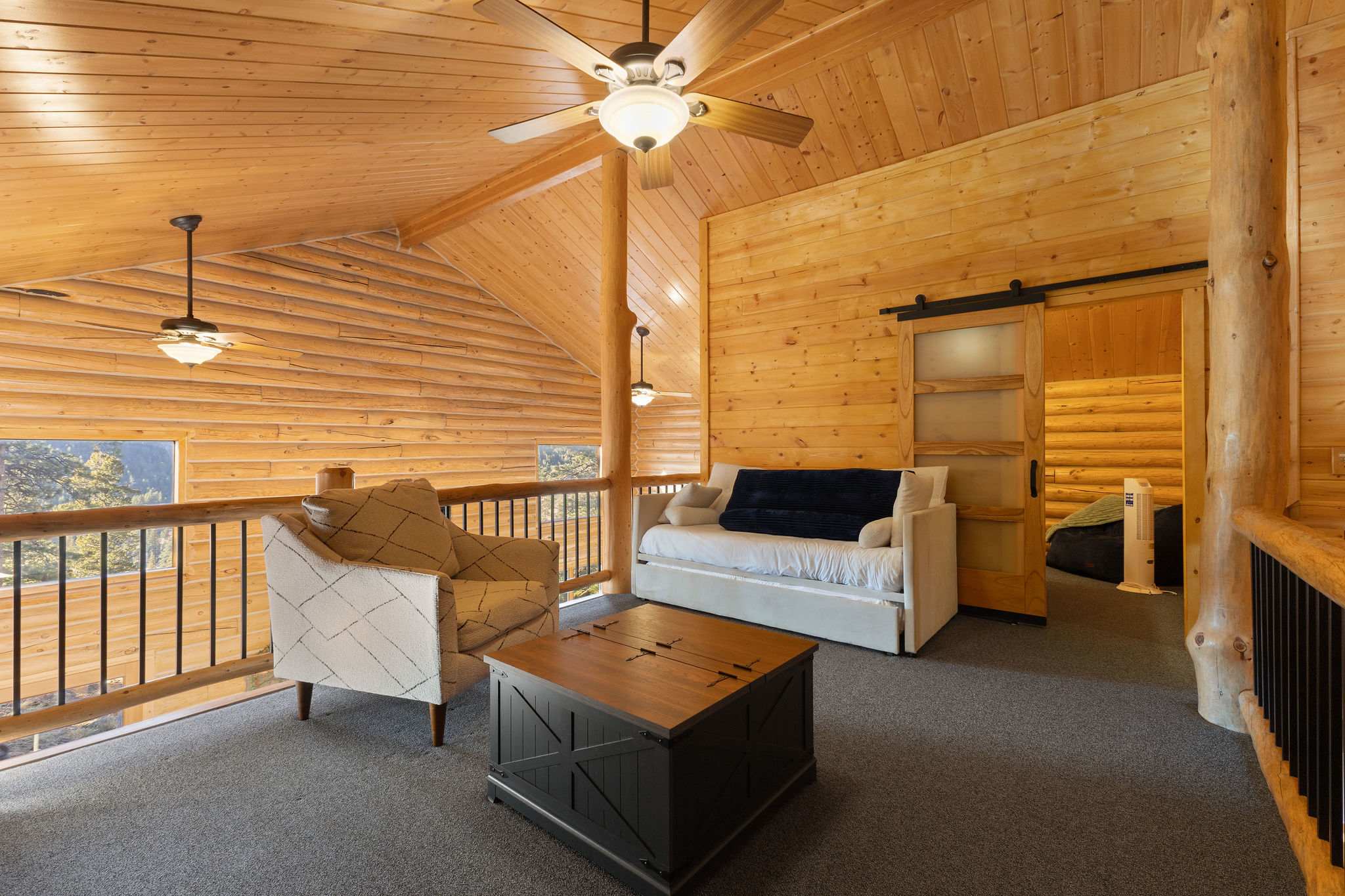 Key Amenities & House Layout at a Glance Our cabin is designed to deliver a luxury resort experience with all the comforts of home. Accommodation: 4 Bedrooms + Loft (Sleeps 13) Beds: 2 King, 1 Queen, 1 Twin Bunk w/ Trundle, 1 Loft Trundle, 1 Air Mattress Bathrooms: 4 Full, Modern Bathrooms—no waiting! Entertainment: Dedicated Game Room with 3-in-1 Table (Billiards, Ping Pong, Air Hockey). Fitness: Private, well-equipped Home Gym with mountain views. Outdoor Living: Two spacious decks, Propane Grill, and a cozy Fire Pit. Cooking: Fully Stocked Kitchen with Keurig Duo and high-end stainless steel appliances. Convenience: Kitchenette/Bar on the lower level, Full-Sized Washer & Dryer (detergent included). Climate: Evaporative Coolers for summer comfort & central as well as baseboard heaters in the winter. Parking: Ample parking with a convenient Circle Driveway. You'll never have to worry about space or comfort! Our cabin features 4 private bedrooms, a flexible loft, and 4 full bathrooms to accommodate your entire group with ease. Primary Suite: A luxurious sanctuary featuring a King Bed and a private ensuite full bathroom. Guest Suite 2: Another spacious room with a comfortable King Bed and easy access to the adjacent full bathroom. Guest Room 3: A cozy and well-appointed room featuring a Queen Bed. Bedroom 4 (Bunk Room): Ideal for kids or flexible sleeping, this room features a Twin Bunk Bed with an additional Twin Trundle underneath (sleeps 3). The Loft Area: A versatile upstairs space perfect for relaxing, featuring a daybed with a Twin Trundle pull-out as well as an air mattress. (sleeps 4). ~~~~~~~~~ Explore Hilltop House: Three Levels of Luxury Hilltop House is seamlessly arranged across three distinct levels, dedicating zones for entertainment, gathering, and peaceful rest. Ground Level: Entertainment & Fitness Hub Your headquarters for fun and fitness—the perfect spot for late-night games or an early morning workout. Game Room: Features a large HD Roku TV, board games, and the versatile 3-in-1 Game Table (billiards, ping pong, or air hockey). Private Gym: Work out with inspiring views! Fully equipped with a stationary bike, rower, weights, and an HD TV. Kitchenette & Bar: Includes a refrigerator, sink, and bar glasses for mixing drinks and snacks without heading upstairs. Full Bathroom: A convenient, beautifully tiled full bath with a spacious shower. Main Level: The Heart of the Home This open-concept level features vaulted ceilings, massive windows, and is bright, welcoming, and perfect for gathering. Living & Dining: A comfortable space with plush sofas and a dining table that seats 10, both offering stunning panoramic mountain views. Gourmet Kitchen: A chef's delight! Features updated stainless steel appliances, granite countertops, an eat-in bar, and a Keurig Duo. We stock all essential spices, coffee, and cookware. Outdoor Deck: Step out to the main deck equipped with a propane fire pit and grill for alfresco dining. Sleeping: Includes a convenient King-sized bedroom and a separate full bathroom (tub/shower combo and double sinks). Upper Level: Quiet Retreats & Exclusive Views The top floor is dedicated to peaceful rest, maximum privacy, and the best views the house offers. Master Suite: The show-stopper! Features a King bed, a private ensuite bathroom with a large tiled shower, and exclusive access to a second, private upper deck. Guest Rooms: Includes the cozy Queen Bedroom and the fun Bunk Room (Twin Bunk w/ Trundle, sleeps 3) with an HD TV. Loft Hangout: A perfect reading nook or extra sleeping space with a comfortable Trundle Bed overlooking the living room. Upstairs Laundry: A shared full bathroom features a walk-in shower, double sinks, and a full-sized washer and dryer (detergent provided).