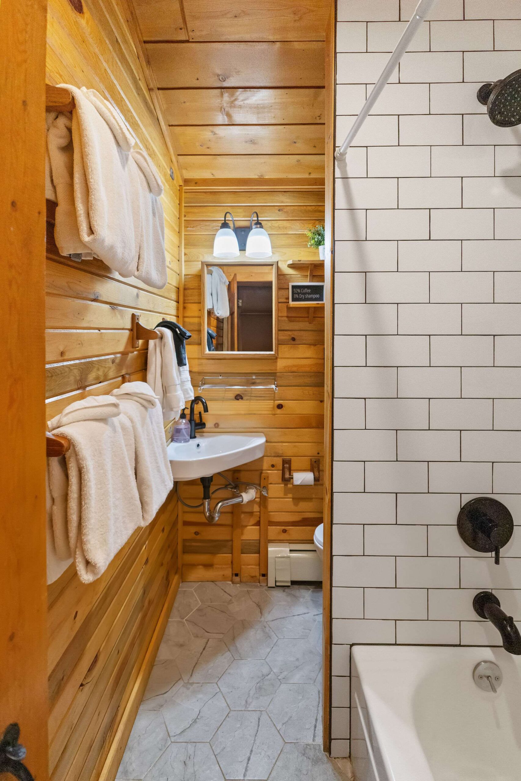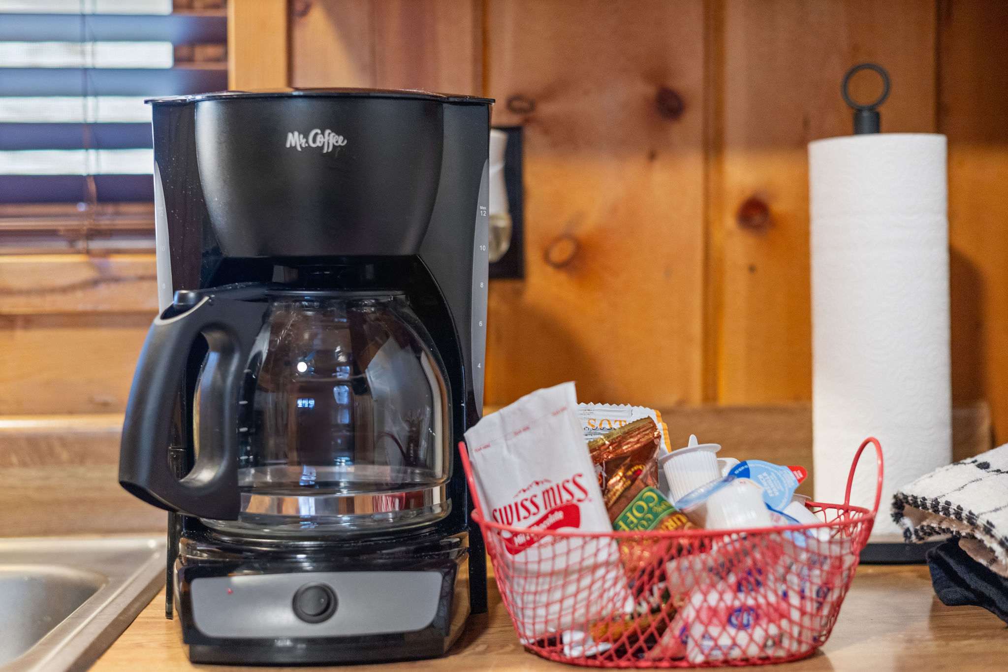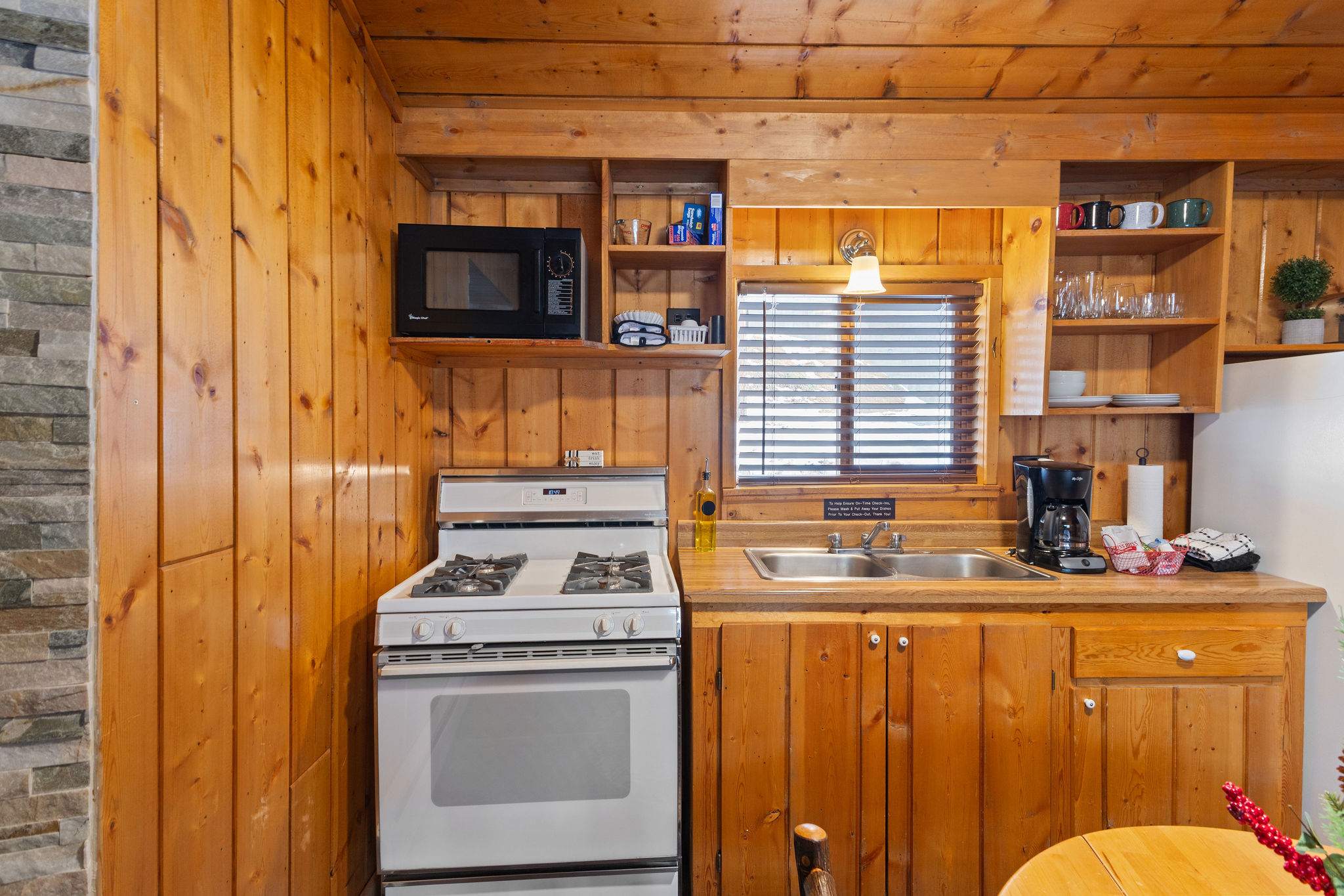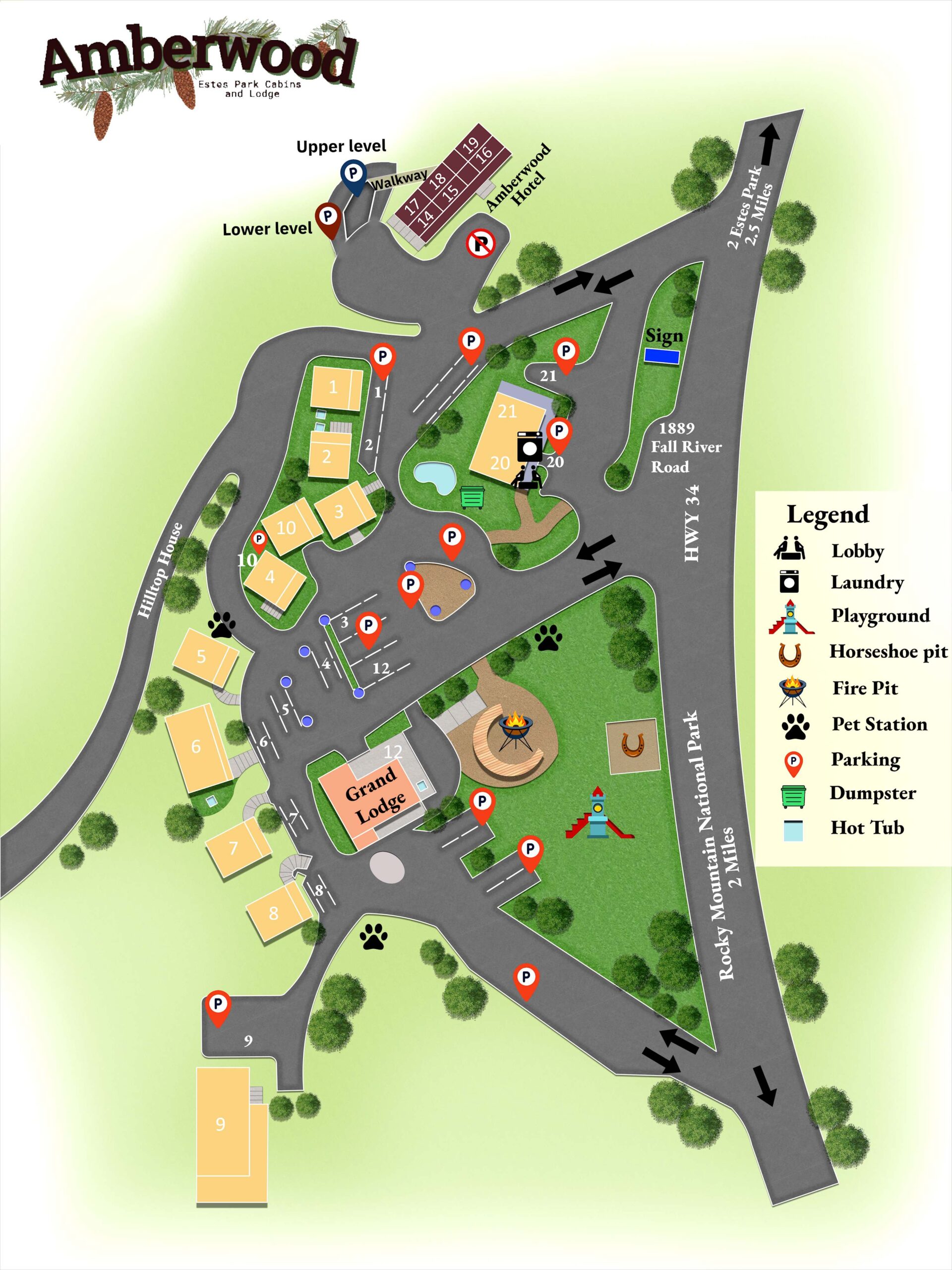 Guests can access the entire cabin as well as our playground and communal spaces on the resort property. There is a new community firepit and cornhole game in front of the Grand Lodge. The Lobby, located at the front of the property by Fall River Road, offers a paid guest laundry room, pamphlets for local attractions, and a coffee bar. You can access the door with your cabin code.