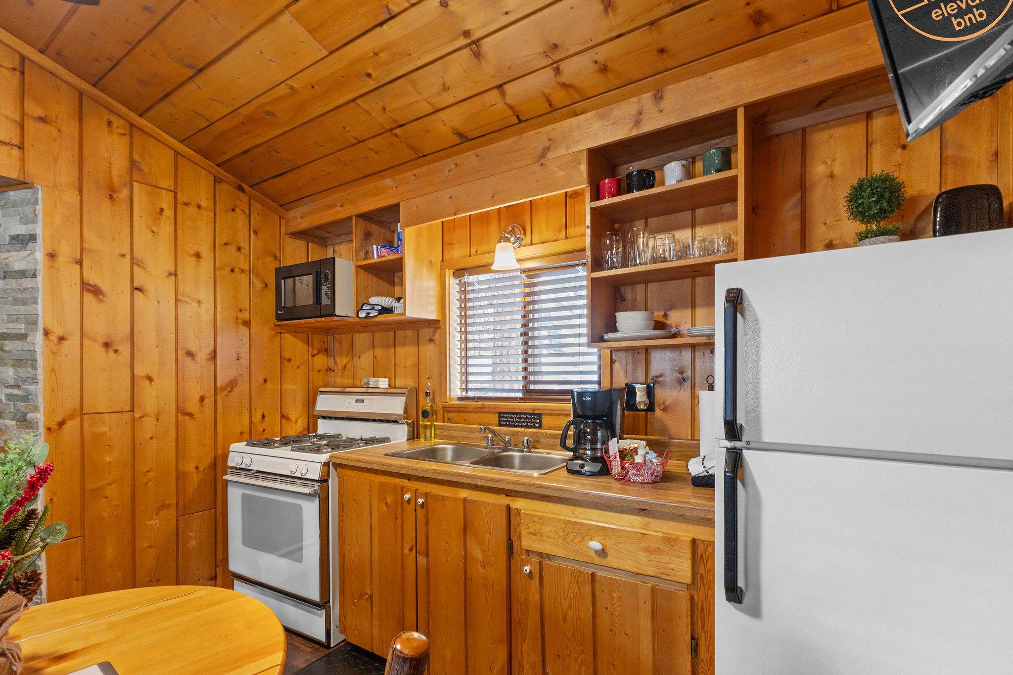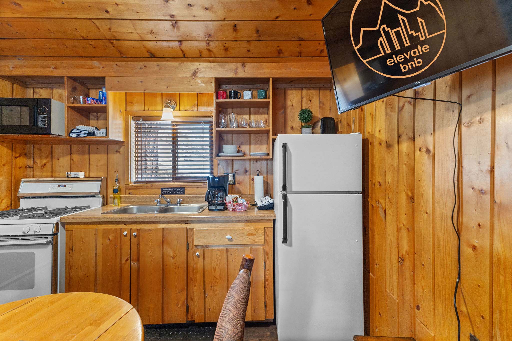 KEY FEATURES: - 1 bedroom with comfortable Queen bed - 1 full bathroom with shower/tub combo + complimentary toiletries - Full kitchen w/ stove + complimentary coffee - Living room with 43” Roku TV + small sofa - Dining table for two - Private front porch with seating - High-speed WiFi throughout property - Free parking in front of cabin - Perfect location near Rocky Mountain National Park BEDROOM & BATHROOM This rustic cabin features a brand-new Queen bed. The bedroom features natural wood finishes, a high-powered ceiling fan and a small closet to hang your clothes. The bathroom features a newly-renovated shower/tub combo and a small window to let in natural light. The bathroom is fully stocked with fresh towels and complimentary toiletries for your convenience. KITCHEN & LIVING SPACE The cabin enters into the spacious living room and kitchen. The living room features a table with two chairs as well as a brand new loveseat and an HD TV. The lovely fireplace has an electric heater for ambiance and warmth. The kitchen is in this space as well and has a stove, oven, full-sized refrigerator, microwave, toaster and of course, a coffee maker. The kitchen is always fully stocked with dishes, utensils, cookware, coffee, cream and sugar. OUTSIDE SPACE This lovely cabin has a front porch with 2 chairs on it. Make a cup of coffee and sit on the porch and watch the sunrise. If you are lucky, you may see deer, elk or mountain goats walking across the property. Amberwood Estes Park has a wooden playground for the kids as well as different areas to walk and enjoy nature. Book Today & Let Us Take Care Of You In Estes Park! *DO not leave pets unattended in cabin without a kennel or crate! Our water system relies on a well, and we request your assistance in conserving water regularly while in Colorado. You might receive reminders from us to be mindful of your water usage during your stay. Brought to you by Elevate BNB Management.